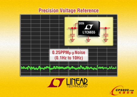 凌力爾特公司 (Linear Technology Corporation) 推出超穩定電壓基準 LTC6655,該器件在 0.1Hz 至 10Hz 的頻率范圍內具有無與倫比且僅為 625nVp-p (0.25ppmp-p) 的噪聲水平。