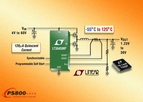 2010年2月2日,凌力爾特公司 (Linear Technology Corporation) 推出 LT3845 的高可靠性 (MP) 級(jí)新版本,該器件具 4V 至 60V 輸入電壓范圍,是低靜態(tài)電流同步降壓型 DC/DC 控制器。其突發(fā)模式 (Burst Mode®) 工作在無(wú)負(fù)載備用情況下保持靜態(tài)電流低于 120uA,這對(duì)于在電池供電應(yīng)用中延長(zhǎng)運(yùn)行時(shí)間是非常有用。該器件強(qiáng)大的內(nèi)置 N 溝道 MOSFET 柵極驅(qū)動(dòng)器以高達(dá) 95% 的效率提供高達(dá) 20A 的輸出電流,從而非常適用于 12V 和 24V 汽車系統(tǒng)、工業(yè)控制、重型設(shè)備、航空電子設(shè)備和軍用系統(tǒng)。