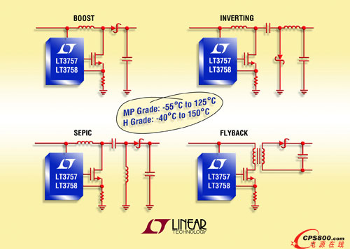 日前,凌力爾特公司 (Linear Technology Corporation) 推出 LT3757 和 LT3758 的 H 級和 MP 級版本,這兩款器件是具寬輸入范圍的 DC/DC 控制器,用于升壓、反激式、SEPIC 和負輸出電源應用。這些器件有兩個內部電壓反饋誤差放大器和基準電壓,每個都能產生正或負的穩定輸出電壓。這些 H 級和 MP 級版本經過測試,保證分別在 -40°C 至 150°C 和 -55°C 至 125°C 的工作結溫范圍內工作。