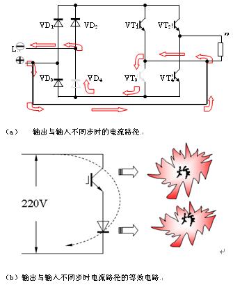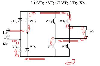 圖3給出了一個單相UPS的主電路圖,它的輸出端不接地,輸入電壓正半波(L為正壓)的情況。此時的電路中無變壓器,逆變器輸出與輸入端的電壓同步鎖相,鎖相的含義是:全橋逆變器幾個功率管的導通情況是根據輸入電壓的相位要求而決定的,如3所示的淺色二極管和IGBT是在電壓正半波(L為正壓)的情況下電流的經過路徑。這時的電流路徑是: