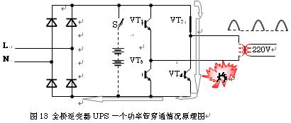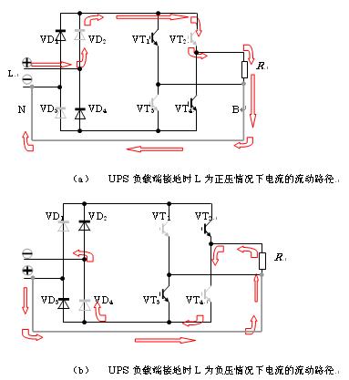 從路徑上可以看出,電流在形成一個回路的流動中經過了兩個整流器二極管和兩個逆變器IGBT。此時UPS的工作是正常的。