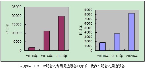 全球新能源汽車EV、HEV、FCV的年產量,2015年將比2010年增加4.1倍,可以達到403.6萬輛;2020年比2010年增加9.2倍,將會超過900萬輛,屆時約占世界汽車總產量的8.6%。為新能源汽車產業配套的新一代設備及產品也將與之同步增長(表2)。