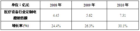 表1 2008-2010年中國醫(yī)療設(shè)備行業(yè)定制電源市場規(guī)模與增長