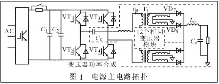 圖1示出電源主電路,包括:工頻三相交流電輸入、整流橋、濾波電感電容、高頻全橋逆變器、高頻變壓器、輸出整流環節、輸出LC濾波器等。其中,C1為小電容,用于濾除尖峰脈沖帶來的毛刺;C2為大容量電容;VTi(i=1~4)構成全橋逆變器;Cz為防止變壓器發生磁偏的隔直電容。