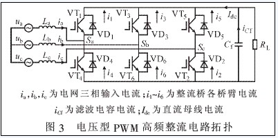傳統電鍍電解直流電源采用晶閘管相控整流模式,導致電網側諧波大、功率因數低。現代電鍍電解開關電源采用二極管整流-IGBT逆變橋-高頻變壓器耦合-低壓整流的拓撲結構,具有體積小、效率高、直流電壓紋波小的優點,但直流母線采用大電容濾波,同樣會導致網側電流畸變、功率因數降低。鑒于電鍍電源要求輸出直流低電壓和大電流,設計的電源采用電壓空間矢量控制三相PWM整流器,從而實現了功率因數校正。采用IGBT全橋逆變,高頻變壓器耦合輸出,最后通過倍頻整流和LC濾波,使直流輸出電壓的質量和裝置能量密度顯著提高。