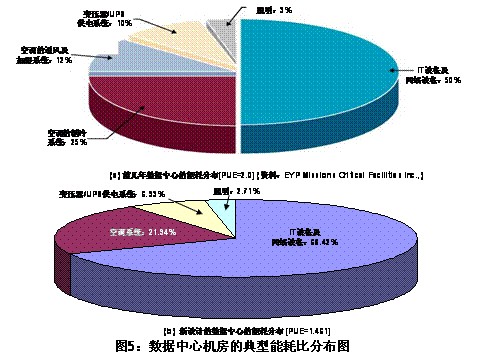 采用能充分利用自然冷源的空調機組、選用帶EC風機或數碼渦旋型的變頻壓縮機的空調機組、通過優化氣流組織來提高“熱交換效率”[典型的設計方案有:機柜采用“面對面、背對背型”的冷熱通道布局;封閉冷通道;封閉熱通道;定向定量的CRV/XD型機柜局部冷卻等]以及在大型數數據中心優選冷凍水空調等節能環保空調技術是機房能否獲得高效節能特認的關鍵所在。其原因是:如圖1所示,對于PUE=2的傳統型IDC機房而言,它的空調系統的功耗約占總功耗的37%左右。對于PUE=1.76的節能型IDC機房而言,它所需空調系統的功耗約占總功耗的34.3%左右。它們所占的能耗比是相當地高的。