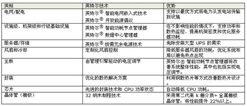 英特爾概括介紹了一系列能夠顯著提高數(shù)據(jù)中心能效的創(chuàng)新技術(shù),其中包括英特爾 智能功耗節(jié)點(diǎn)管理器、英特爾數(shù)據(jù)中心管理器、高環(huán)境溫度(HTA)數(shù)據(jù)中心及若干如功耗和散熱感知調(diào)度(PTAS)和英特爾服務(wù)器電池備份解決方案這樣的等未來型技術(shù)。