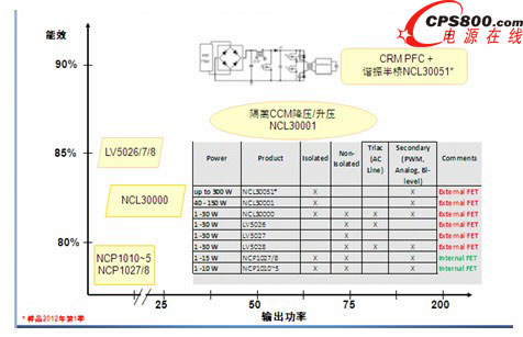 在安森美半導體用于LED照明的AC-DC電源方案中,1至10 W的照明應用中推薦使用NCP1010~5,1至15 W可使用NCP1027/8,這些方案集成了MOS管,適用于隔離和非隔離應用,支持次級PWM調光、模擬調光或雙亮度等級調光,能效高達75-80%;1至30 W的應用可以使用LV5026、5027、5028,支持隔離方案,典型能效85%左右;1至40 W推薦使用NCL30000,可進行初級可控硅調光,適用于隔離和非隔離方案,隔離方案能效80-85%。40至150 W推薦使用NCL30001,它是一個連續導電模式(CCM)控制芯片,隔離方案的典型能效85-90%;更大功率推薦使用NCL30051。圖2是這些方案輸出功率與能效的對比。以下將具體介紹這些方案的功能和特點。