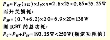 在計算了IGBT的總平均功耗PC=193.25W后,就可估算IGBT表面部分的平均結溫Tj=TC+PC×RTH(j-C),其中TC為環境溫度(假設環境溫度為30°C),PC為總平均功耗,RTH(j-C)為標定的結殼熱阻(查CT60的標定結殼熱阻為0.4°C/W),則IGBT的表面平均結溫: