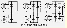其次,好的緩沖電路可以有效控制浪涌電壓的關斷和用續流二極管恢復浪涌電壓,用以減少功率器件的開關損耗。IGBT緩沖電路與傳統的雙極晶體管緩沖電路存在兩個方面的區別:一是IGBT具有強大的開關工作區,緩沖電路只需控制瞬態電壓而不需要保護就可以抑制伴生達林頓晶體管的二次擊穿超限;二是IGBT常工作在比達林頓高得多的頻率范圍。三種IGBT緩沖電路如圖3所示。