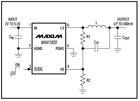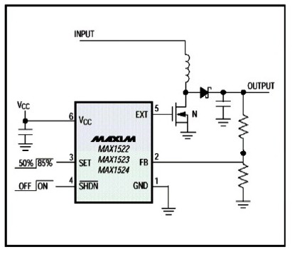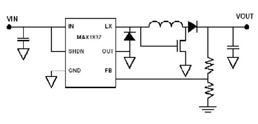 有些設計者因為考慮到高效率,而選擇以升壓方式產生一組輸入高于輸出電壓來提高效率,如圖 3 的升壓架構,由于需外加 MOSFET 作切換開關,因此可 提供較大的輸出功率。如果是因為空間的限制,外加 MOSFET 開關以及輸出二極體就會成為設計者的負擔,此時內建 MOSFET 切換開關與輸出二極體的升壓 DC-DC 轉換器例如 MAX1722 ,就適合于此應用中,不僅省空間、效能好,更能省成本。