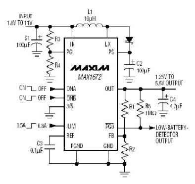 從 上述的式子可得知輸出電壓與輸入電壓和周期的關系,想得到較高或較低的輸出電壓只要控制 1/1-D 的比值大小即可。設計者也可以直接使用一組 Buck/Boost 電源 IC ,來產生所需的電壓輸出,如圖 2 便是一組直接昇降壓的 IC 。其結合一組升壓轉換器與線性穩壓器來提供可升壓也可降壓的電壓轉 換器。這個轉換器為輸出電壓以下和超出的輸入提供一個穩定的輸出電壓。它可從 1.8V 到 11V 輸入范圍和預置 3.3V 或者 5V 的輸出。也能夠把這個輸出電 壓使用兩個電阻分壓從 1.25V 至 5.5V ,其效率大致上可高達 85% 。如果需要的輸出電壓是在 3.5V 至 4V 之間,可以用組合的方式來產生一組升降壓的 輸出,設計者只需要一組升壓轉換器與一組線性穩壓器便行,例如 MAX1606 升壓轉換器與 MAX8512 線性穩壓器的組合。