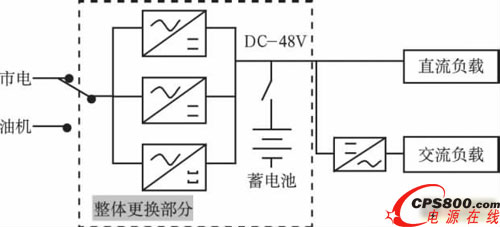 -48 V直流開關電源系統如圖1.開關電源設備整體更換更新基本有以下幾種基本方案,具體優缺點分析如下: