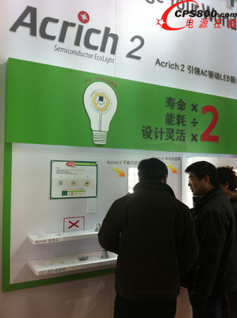 本次展會重點推出的新產品是首爾半導體所獨有專利技術的交流電驅動LED Acrich2系列模塊。與傳統的LED相比,Acrich2不需要AC/DC轉換,具有使用壽命長,能源消耗低和設計便捷等特點。Acrich2以4W、8W、12W和16W的模塊形式推出,能提供一個具有替代性的LED解決方案,它不但能取代40W、60W和100W的白熾燈,同時還能代替MR16鹵素燈和筒燈。與首爾半導體之前推出的“Acrich”產品相比,“Acrich 2”的功率因數提升至97%,帶來了多于90%的功率效率增幅。同時,“Acrich 2”的總諧波失真(THD)低于25%,符合了不同國家的要求,也符合美國能源部(DOE)及其他機構的要求。通過這項領先的IC技術,燈具制造商可直接把內置了“Acrich 2”的產品插入墻體而無需考慮其他電氣條件。