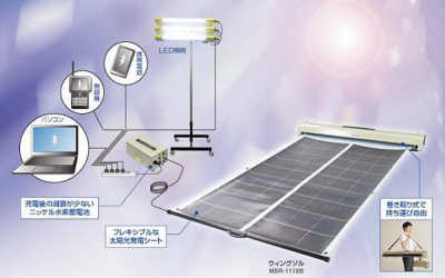 據國外媒體報道,日本太陽工業近日推出了一款可卷起的便攜應急用太陽能電池系統,以應付各種自然災害帶來的電力缺乏。本產品由太陽能單元和電池單元所組成。太陽能單元的面板采用一張柔韌的非晶質太陽能薄膜,公司宣稱其可以在很短的時間內卷起帶走。本產品號稱完全綠色,工作時不會發出噪音。太陽工業表示,在天氣晴朗的情況下,要充滿電需要大約8個小時,可以支持一臺電腦工作2到3小時。