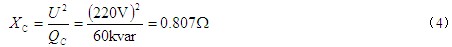 如果負載的輸入功率因數與UPS的負載功率因數不相等,情形又會怎樣呢?比如后面的負載是線性負載,即負載的輸入功率因數=1,這種情況經常出現在UPS帶假負載考機情況,如圖4所示。在這里有一個很大的區別,負載中的電感部分沒有了。這就造成了逆變器后面電容器C的無功功率再也不能向負載端提供的局面。由于60kvar的容抗XC是: