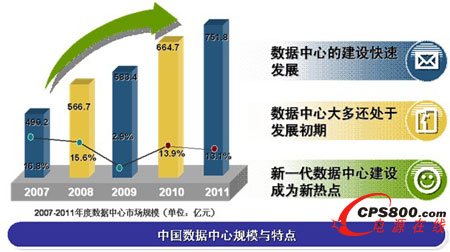 在中國整體宏觀經濟高速發展的背景下,中國的數據中心市場一直保持著高速發展的趨勢,盡管在2009年受到全球金融危機的影響,數據中心市場的增長率出現了一定比例的下滑,但隨著中國相關經濟刺激計劃的實施,整體宏觀經濟實現了“V”型反轉,數據中心市場也出現了快速回升的態勢,2010年重新回到兩位數的增長率上。據ICTresearch研究,2011年數據中心市場規模為751.8億元,比2010年增長13.1%。