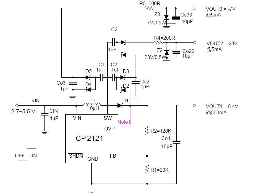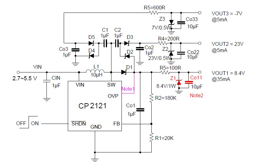 本文介紹了采用低成本、高效率的升壓型電源管理芯片CP212X系列產品實現多路正負電源輸出,結合TFT模組供電的需求,給出了基于CP212X實現的TFT模組供電系統方案,文中詳細討論了CP212X系列產品實現多路正負電壓輸出的解決方案,并以TFT模塊的供電系統為典型案例,給出了基于CP212X的TFT模組供電系統的典型應用方案。該方案可滿足TFT模組供電系統的各路電壓需求,電路清晰簡單,應用靈活,可廣泛應用于各類手持設備,為TFT模組提供全套電源解決方案。