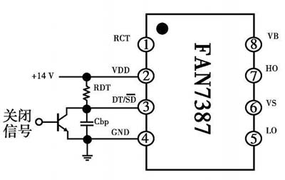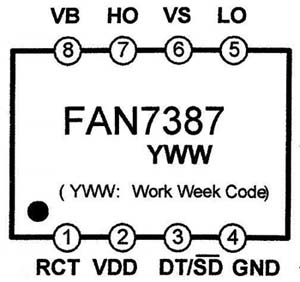 FAN7387采用工作溫度為- 40 到125 并符合歐盟ROHS指令的8引腳SOP和D IP封裝,引腳排列如圖1所示。