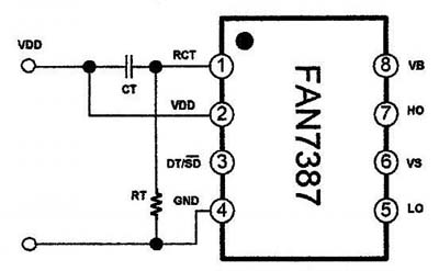 FAN7387芯片集成了電源電路、鎮流器控制電路和高端與低端(外部MOSFET ) 柵極驅動器,如圖2所示。