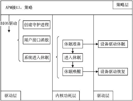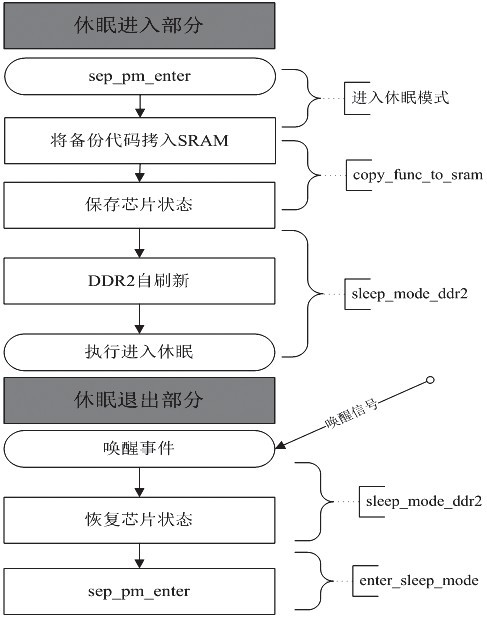 圖1是APM技術在Linux中的架構圖。用戶通過用戶態的APM接口或策略向BIOS申請休眠請求,BIOS設備接收到用戶層的休眠請求后會調用內核低功耗層的接口函數,從而實現系統進入休眠的一系列操作;在接收到喚醒信號后內核低功耗層會執行喚醒操作,與此同時低功耗層也會調用外設驅動的電源管理接口讓設備跟隨系統實現喚醒。SEP0611無BIOS,系統喚醒后會回到bootloader執行。