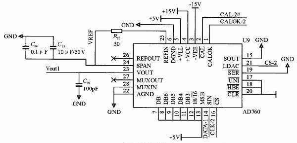 D/A轉換采用ADI公司的AD760芯片,如圖2所示是D/A轉換電路圖。AD760是一款16/18位可選、可進行自校準的DAC,內置片內基準電壓源、雙緩沖鎖存器和輸出放大器。它采用ADI公司BiMOSII工藝制造,可以在同一芯片上實現高精度雙極性線性電路與低功耗CMOS邏輯功能。只需發送脈沖使CAL引腳變為低電平,便會啟動自校準功能。CALOK引腳會顯示何時順利完成校準。校準期間,可以利用輸出多路復用器(MUXOUT)將輸出發送至輸出范圍底部。數據可以采用標準二進制、串行數據或雙8位字節格式載入AD760.在串行模式下,可以使用16位或18位數據;串行模式輸入格式通過引腳選擇,可以是MSB優先或LSB優先。通過具有雙重功能的三個數字輸入引腳(引腳12、13和14)來實現。在字節模式下,用戶同樣可以定義優先加載高字節還是低字節數據。雙緩沖鎖存結構不僅可以消除數據偏斜誤差,還能夠在多DAC系統中同時更新各DAC.當CLR選通時,可以利用異步CLR功能將輸出清零至負滿量程或中量程,具體取決于引腳17的狀態。