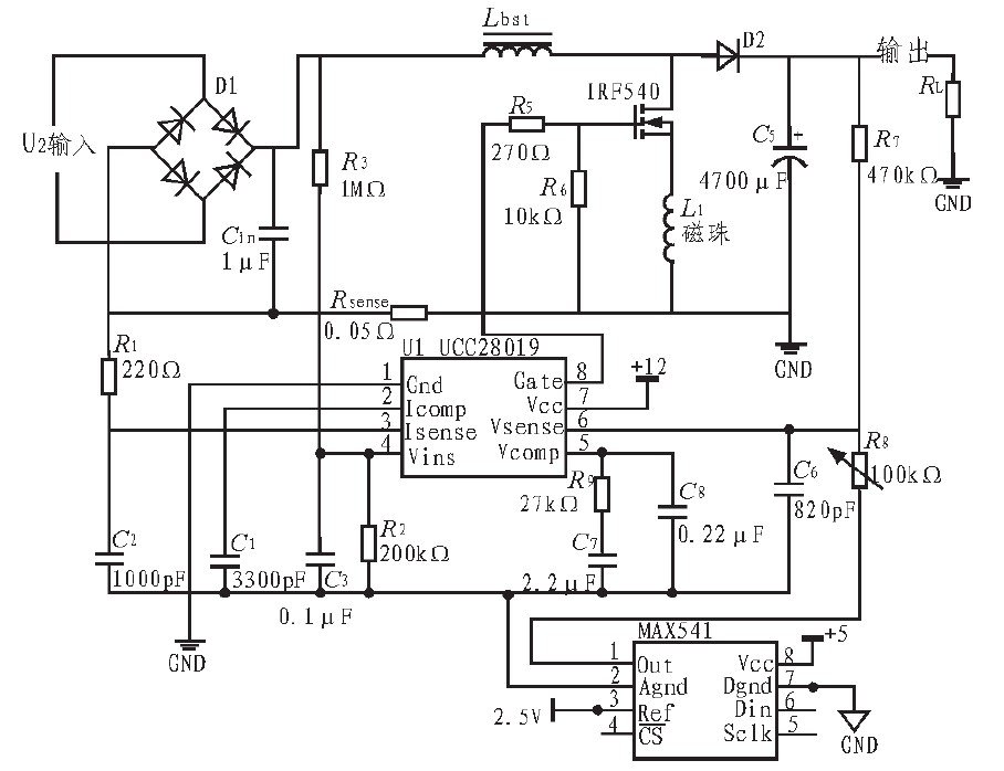 1 系統總體方案設計及實現方框圖系統主要包括整流、功率因數校正、Boost 升壓等幾個部分。電源變壓器將較高的市電電壓降低到符合整流電路所需要的交流電壓,經整流電路后得到直流電。將得到的直流電送入Boost 升壓電路進行升壓,Boost 電路的輸出電壓極性與輸入電壓極性相同,但總高于輸入電壓,輸入電流連續、輸出電壓與負載電流無關,輸出阻抗非常低,通過控制開關管通斷的占空比來控制輸出電壓。PFC 控制部分采用有源PFC(也稱主動式PFC) 功率因數校正可以實現高輸入功率因數和低輸入電流諧波含量,并且開關管的電壓應力和電流應力都比較小。電壓適應范圍寬,功率因數高。本系統采用兩級PFC 技術,即在整流濾波和DC/DC 功率級之間加入有源PFC電路為前置級,用于調高功率因數和實現DC/DC 級輸入的預穩,該技術一般用于大功率輸出場合。