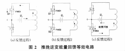 圖2(a)為S1導通、S2關斷時的等效電路,圖中箭頭為電流流向,從電源UI正極流出,經過S1流入電源UI負極,即地,此時FWD1不導通;當S1關斷時,S2未導通之前,由于原邊能量的儲存和漏電感的原因,S1的端電壓將升高,并通過變壓器耦合使得S2的端電壓下降,此時與S2并聯的能量恢復二極管FWD2還未導通,電路中并沒有電流流過,直到在變壓器原邊繞組上產生上正下負的感生電壓。如圖2(b);FWD2導通,把反激能量反饋到電源中去,如圖2(c),箭頭指向為能量回饋的方向。