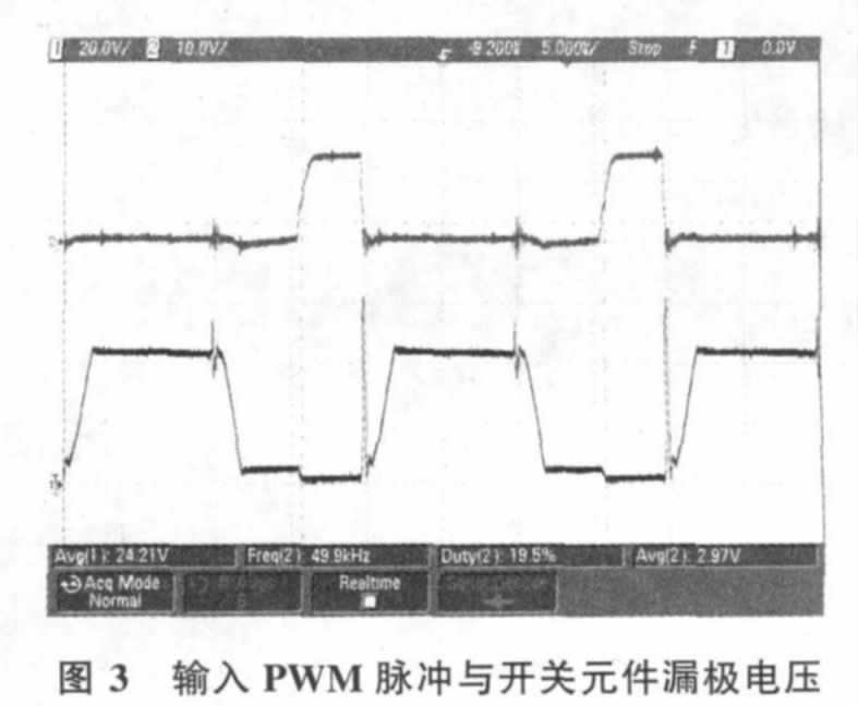 當S1的PWN 信號下降沿來臨,S1關斷,漏極產生較高的沖擊電壓,并使得與S2并聯的反饋能量二極管FWD2導通,形成能量回饋回路,此時S2漏極產生較高的沖擊電流,見圖4。