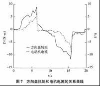 根據電動轉向控制系統對穩定性和跟蹤性的需要,采用最優H二控制器編制電動轉向系統控制程序,并在汽車電動轉向試驗臺上進行臺架模擬試驗,車速信號用模擬車速傳感器發出的脈沖信號代替網。圖7為中等車速轉向助力時,測量的方向盤轉矩(T)和助力電動機電流(I)變化曲線。從圖7中可以看出,在轉向過程中,助力電動機電流隨著方向盤轉矩的變化而變化,電動機電流的變化趨勢和方向盤轉矩的變化趨勢相吻合,表明電動機的助力轉矩對方向盤轉矩有良好的跟蹤性能。轉向操作時,無助力滯后感,轉向平穩,表明轉向系統具有良好的跟蹤性能和操縱穩定性。