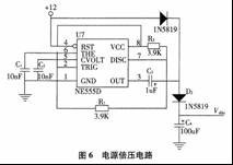 電源倍壓電路如圖6所示,NE555定時器工作于多諧振蕩器模式,于引腳3產生幅值等于NE555的供電電壓,頻率為1/0.7(R2+2R1)C1的矩形波。C3、C4,Dl和D2構成電荷泵電路。當NE555引腳3輸出高電平時,由于電容電壓不能突變,C3正極電壓為24V或接近24V,并通過D2向C4充電,使C4電壓為24V或接近24V。由于受電路的工作效率、二極管D1和D2上的正向電壓降以及負載能力的限制,使得系統輸出電壓低于供電電壓的2倍。
