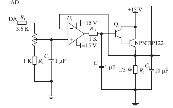 恒流源電路原理結構圖如圖2 所示,由于D/ A轉換輸出的模擬信號不穩定,加上C3 穩定電壓。經過3.6 K 的電阻和1 K 的電位器加到單運放OP07 的同相輸入端,調節電位器的阻值的大小可調節同相輸入端的電位,從而改變輸出點的電位,輸出電位加到達林頓管的B 管腳上,進入達林頓信號產生自激信號,通過C1過濾掉。利用達林頓管的電流放大特性,可實現大電流的輸出,電流放大倍數為1 000 ~15 000倍。