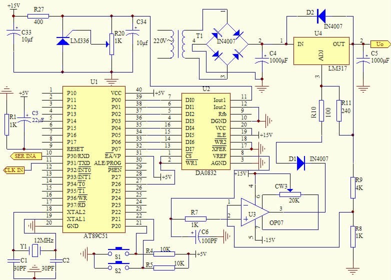 本電路的硬件組成部分主要由單片機(AT89C51)、變壓器、整流電路、濾波電路、穩壓器(LM317)、參考電壓電路、D/A轉換電路(DA0832)、放大電路、顯示電路等組成。