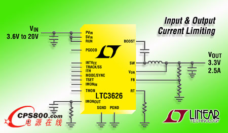 LTC3626 是一款高效率、3MHz 同步降壓型穩壓器,該器件提供輸入和輸出電流限制及監視功能。LTC3626 具有獨特的恒定頻率 / 受控接通時間和電流模式架構,該架構在輸出電壓低至 0.6V 時,可在 3mm x 4mm QFN 封裝中提供高達 2.5A 的連續輸出電流。其電流模式工作甚至在高降壓比時也能提供卓越的電壓和負載瞬態響應。LTC3626 在 3.6V 至 20V 的輸入電壓范圍內工作,從而使該器件非常適用于種類繁多的應用,包括雙節 / 多節鋰離子電池組和 5V 至 18V 中間總線系統。其平均輸入電流和輸出電流限制是引腳可編程的,從而使該器件非常適用于 USB 電源等應用。LTC3626 的開關頻率在 500kHz 至 3MHz 范圍內是用戶可編程和可同步的,從而允許使用纖巧和低成本的電容器和電感器。