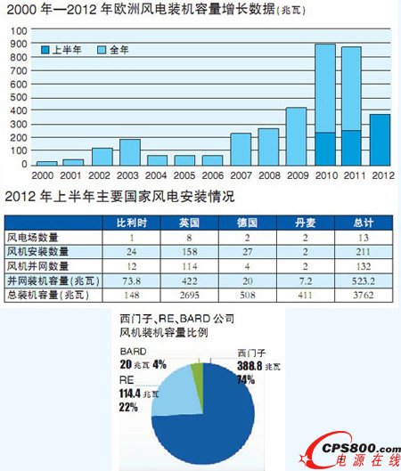 報告顯示,2012年上半年歐洲新增并網風力發電機132臺,裝機容量達523.2兆瓦。目前還有13個風力發電站正在建設中,全部完工后可新增裝機容量3762兆瓦。