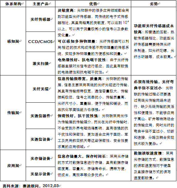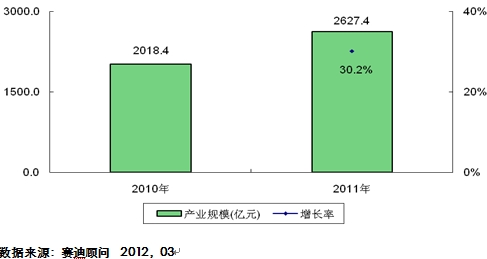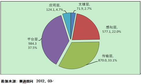 2011年,中國物聯網產業規模達2627.4億元,同比增長30.2%。其中,支撐層、感知層、傳輸層、平臺層、應用層規模分別為71.9億元、577.1億元、870.0億元、984.3億元和124.1億元,各層在整個產業中的占比分別為2.7%、22.0%、33.1%、37.5%和4.7%。相比其它各層而言,物聯網應用層的規模明顯偏小,說明我國的物聯網應用尚處起步階段。