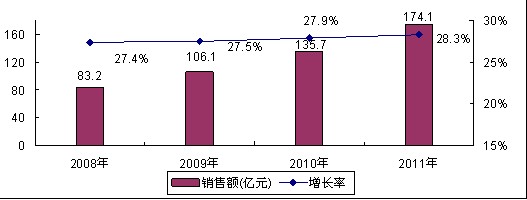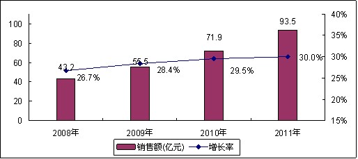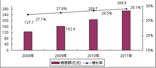 2008-2011年中國醫用便攜醫療電子市場規模與增長(來源:賽迪顧問)