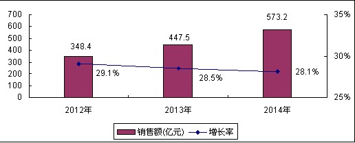 據預測,2012年中國便攜醫療電子市場將實現銷售額348.4億元,同比增長29.1%;2013年則實現銷售額447.5億元,同比增長28.5%;2014年突破500億元大關,市場達573.2億元,同比增長28.1%。