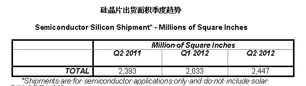 2012年第二季度的硅片出貨總面積達到了24.47億平方英寸,較第一季度的20.33億平方英寸增長了20%,比去年同期增長了2%。