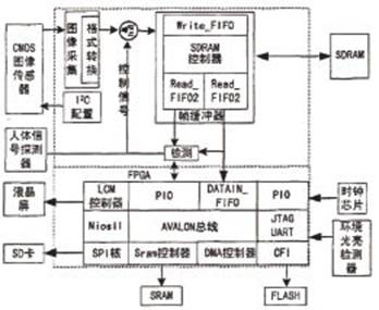 為了實現自動圖像報警和圖像采集,本文設計了動體檢測算法,這是因為絕大多數情況下我們只對監控區域中運動的物體感興 趣,這樣可以過濾掉只包含靜態背景的圖像,從而降低了對有限的嵌入式硬件資源的消耗。由于活動物體大多是人,而且這也是圖像監控的目標,為此加入了人體信 號探測器,用以輔助動體檢測,以達到降低圖像報警誤報率的目的。本系統主要集成了圖像采集、控制和存儲等器件或芯片,組成了以FPGA為控制核心的實時圖 像監控系統。系統的總體方案如圖1所示。