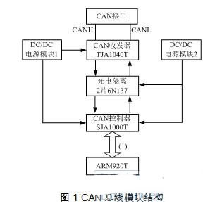 為增強CAN總線節點的抗干擾能力 ,SJA1000T的TXO和RXO并不直接與TJA1040的TXD和RXD相連,而是通過兩片光耦隔離芯片6N137與TJA1040T相連。很好地實現了收發器與控制器之間的電氣隔離,保護智能節點核心電路安全工作;并實現了總線上各CAN節點間的電氣隔離。需要強調的是:為實現這種電氣隔離,光耦器件兩側的直流電源必須是兩個無直接電氣聯系、相互隔離的直流電源。因而采用兩路DC-DC隔離電源實現。為進一步加強安全性和抗干擾能力,可在總線收發器TJA1040T與CAN總線間串接限流電阻,避免TJA1040T受過流沖擊。同時,在CANH和CANL,與地之間并聯了濾波電容,可以起到濾除總線上的高頻干擾,并具備一定的防電磁輻射能力。此外,通信信號在線路上傳輸時,信號傳輸到導線的端點時會發生反射,反射信號會干擾正常信號的傳輸。為消除這種影響,可在CAN總線兩端并接匹配電阻,起到匹配總線阻抗和消除反射的雙重作用。若忽略這些措施,會使數據通信的抗干擾性和可靠性大大降低,甚至無法通信。