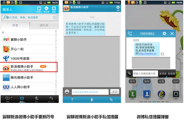 小編測試后發現,綁定翼聊小助手后,只要綁定賬戶的微博有私信,翼聊都會第一時間發送免費"翼推送"微博私信短信提醒。這是本次新浪微博私信提醒功能的一大亮點!