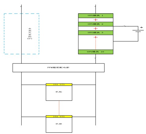 評標小組討論后認為:此方案前期投資稍低,后續擴容復雜并且投資巨大。同時為了兼容單電源輸入負載,采用了大功率STS要求系統同步運行,失去了雙母線的獨立性,同時STS無容錯能力。