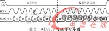 AD9959的串行工作模式都工作于寄存器級傳輸,而不是字節級傳輸。但是AD9959提供的SYNC I/O功能可以中斷I/O操作,這種模式可以使寄存器的某個字節進行設置,從而減少了設置時間。所有指令都是在SCLK的上升沿寫入,而在SCLK的下降沿讀出的。在本文所設計的雷達信號源中,對于AD9959的控制模式采用了Single--Bit Serial 2-wire Mode,在這種工作模式下,AD9959使用SDIO 0作為數據傳輸管腳,要使AD9959工作于這種模式,可以將CSR寄存器中的CSR<2:1>設置為00即可。在Single-Bit Serial 2-wire Mode傳輸模式下,支持MSB優先和LSB優先兩種模式。