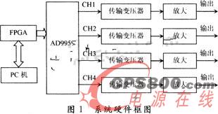 用戶通過計算機將所產生信號的參數傳送給FPGA,FPGA接收到相應的參數后,控制AD9959輸出相應的雷達信號,由于AD9959輸出信號是差分電流信號,因此在系統設計時,采用1:1傳輸變壓器將差分的電流信號轉化為單端的電壓信號,同時為了提高系統的輸出驅動能力,在變壓器后面進行了信號放大,系統框圖如圖1所示。