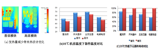 圖1 普效與高效模塊熱設計、運行溫度、壽命對比