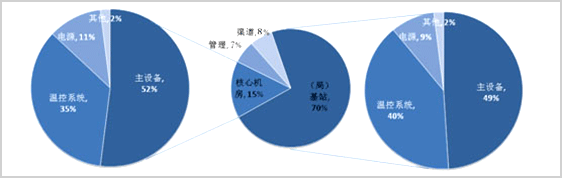 基于中國通信行業(yè)節(jié)能減排、構(gòu)建綠色通信的需求,對其進(jìn)行網(wǎng)絡(luò)實際能耗分析,整個通信網(wǎng)絡(luò)能耗狀況呈現(xiàn)出如圖1所示。從圖1可以看出,通信主設(shè)備的能耗占總能耗的50%左右,除主設(shè)備外,溫控系統(tǒng)和電源損耗是能耗的關(guān)鍵部分。由于網(wǎng)絡(luò)業(yè)務(wù)演進(jìn)快,主設(shè)備搬遷周期短,耗能的主設(shè)備已經(jīng)被節(jié)能設(shè)備取代,而電源損耗約占整個網(wǎng)絡(luò)能耗的10%,在新建和擴容站點、機房部署高效電源以及普通電源的高效化改造后,能夠減少60%的能量轉(zhuǎn)換損失。高效電源熱量釋放少,溫控系統(tǒng)部署隨之減少,其能耗亦可得以降低。綜合看來,僅電源系統(tǒng)高效化這項舉措就能降低整個網(wǎng)絡(luò)能耗6%至7%。