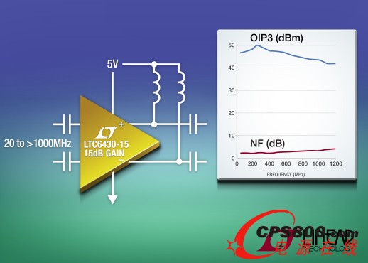 加利福尼亞州米爾皮塔斯 (MILPITAS, CA) – 2013 年 1 月 28 日 – 凌力爾特公司 (Linear Technology Corporation) 推出 15dB 放大器 LTC6430-15,該器件在 100Ω 差分環(huán)境中,于 20MHz 至 1GHz 及更高頻率范圍內(nèi)實現(xiàn)了很大的動態(tài)范圍。凌力爾特可提供兩種性能級別的版本。在 240MHz 時,A 級版本 OIP3 的典型值為 50dBm,經(jīng)過全面測試并保證最小值為 47dBm。噪聲指數(shù)為 3dB,這對應(yīng)于 1nV/√Hz 輸入?yún)⒖挤糯笃髟肼。DC 功耗為 800mW。這種低噪聲和低失真相結(jié)合,為高性能中頻通信和 CATV 應(yīng)用提供了寬動態(tài)范圍。