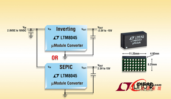 日前凌力爾特公司 (Linear Technology Corporation) 推出一款 2.8V 至 18V 輸入的多拓撲 DC/DC µModule® (微型模塊) 轉換器 LTM8045,其具有內置電感器、電源開關和 DC/DC 控制器,可提供高達 700mA 的輸出電流。只需增設兩個電阻器和兩個電容器,就能把 LTM8045 配置以調節一個介于 2.5V 和 15V 之間的正輸出電壓 (SEPIC 拓撲) 或一個介于 -2.5V 和 -15V 之間的負輸出電壓 (負輸出拓撲)。LTM8045 專為通信、成像和手持測試設備中的負載點調節而設計。