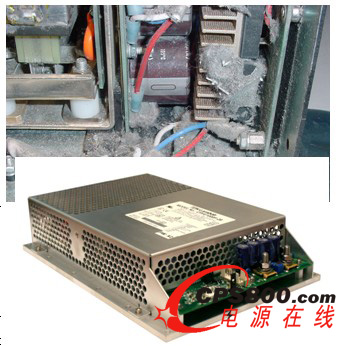 附圖展示了一個在郵政站(郵件在此被自動處理和分類)運行多年的電源。 如圖所示(在風扇被拆下后),碎紙片與飛揚的粉塵污染物通過風扇被吸入電源,最終導致保險絲燒斷。
